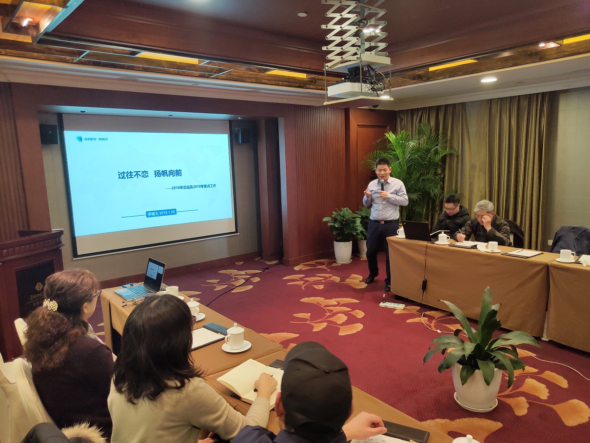 2019年1月26日,揚(yáng)帆新材年度高管會(huì)議在杭州召開,公司控股股東浙江揚(yáng)帆控股集團(tuán)有限公司董事長樊培仁,揚(yáng)帆新材董事長樊彬,總裁李耀土,副總裁朱俊飛、陶明、劉輝,財(cái)務(wù)總監(jiān)上官云明,技術(shù)總監(jiān)吳紅輝,董事會(huì)秘書樊相東以及各子公司高管悉數(shù)出席并作年度工作報(bào)告。