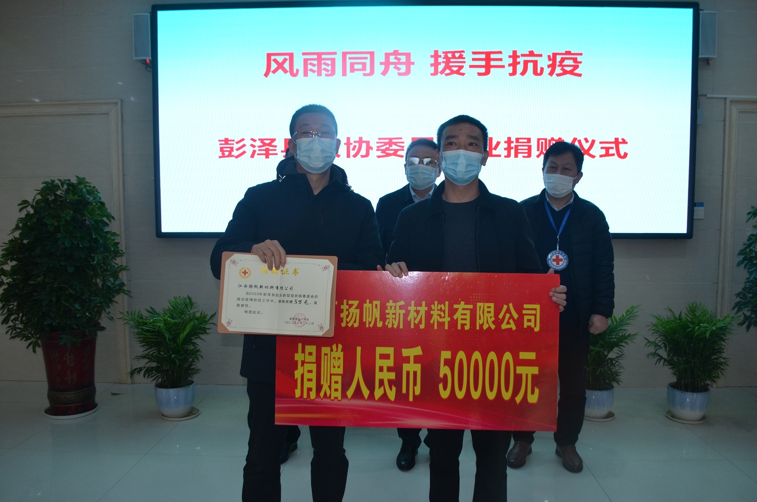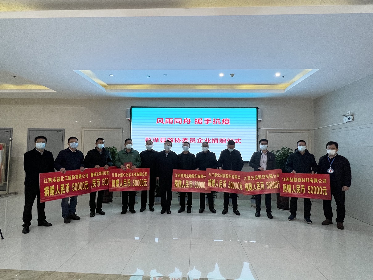 3月22日,江西揚帆在彭澤縣政協牽頭組織的“風雨同舟、援手抗疫”捐贈儀式上,向彭澤縣防疫指揮部捐贈抗疫資金5萬元,以實際行動表達了企業同心協力抗擊疫情的責任和當擔。