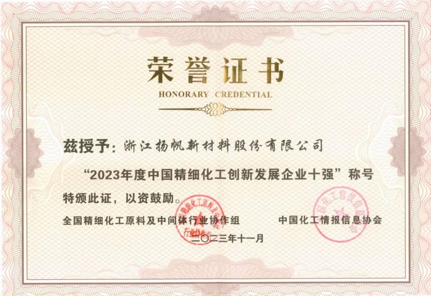 揚帆新材榮登2023年度中國精細化工百強及創新發展企業十強榜單